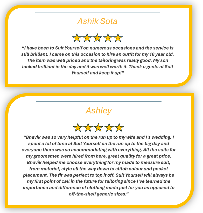When you collect your suits, we’ll agree on a simple return date. After your celebration, just bring them back and let us take care of the rest. With thousands of happy customers behind us, we look forward to making your experience stress-free, smooth, and memorable.